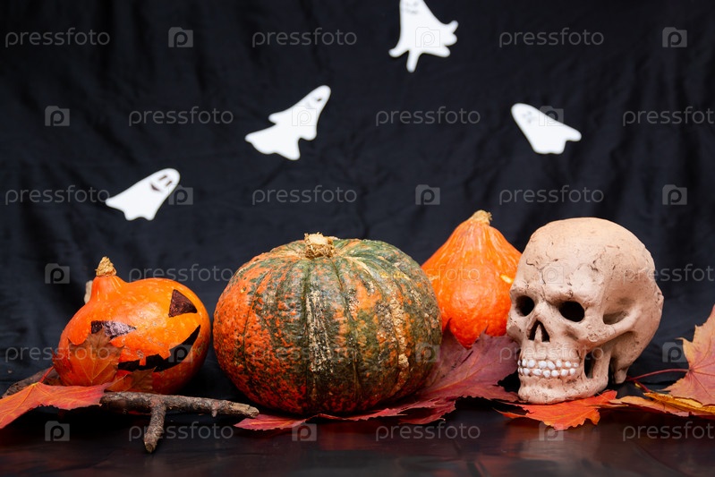 Хэллоуин натюрморт с тыквами, черепом и осенними листьями на черном фоне