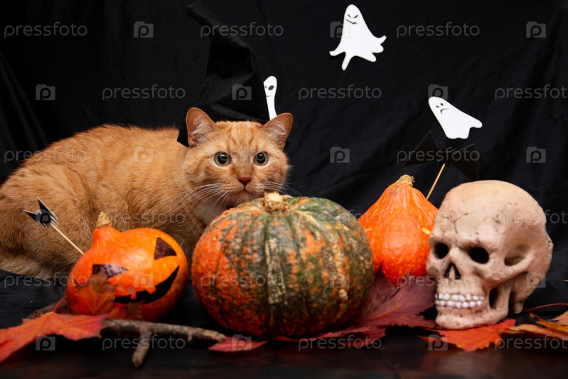 Рыжий кот в черной шляпе с хэллоуинской тыквой и осенними листьями на черном фоне
