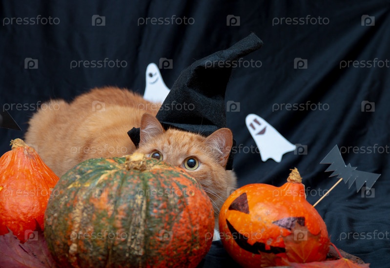 Рыжий кот выглядывает из-за тыквы. хэллоуин фон, череп, летучие мыши, голова Джека на черном фоне, рыжий кот