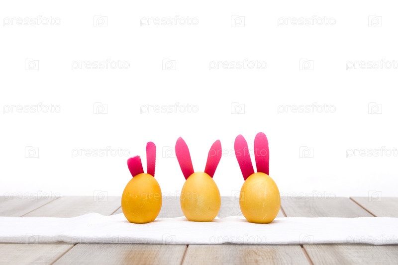 Три желтых яйца на полотенце с кроличьими ушами на белом фоне, деревянный стол, место для копирования, пасхальная открытка, место для текста
