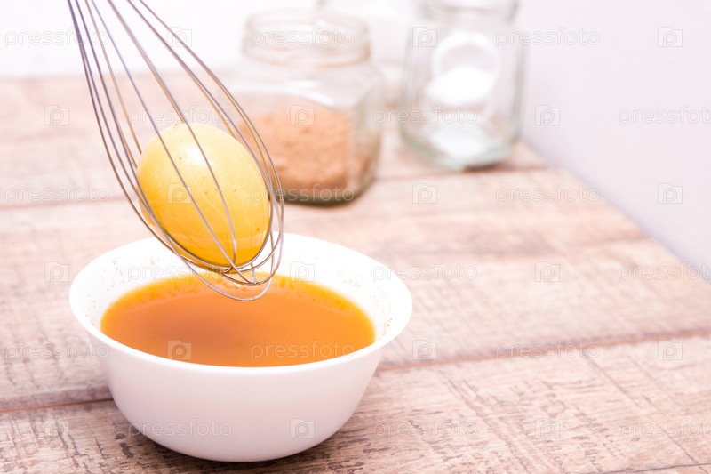 Яйцо в кухонном венчике, погруженное в краску, желтое пасхальное яйцо, банки на заднем плане, пространство для копирования, деревянный стол, процесс подготовки к Пасхе