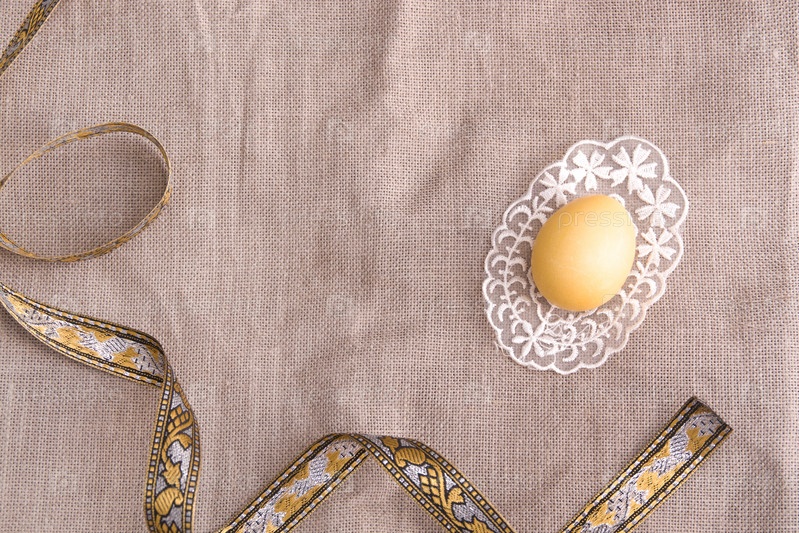 Пасхальное желтое яйцо на кружеве, золотое кружево, фон из льняной ткани, пространство для копирования, вид сверху, рамка, пасхальная спинка