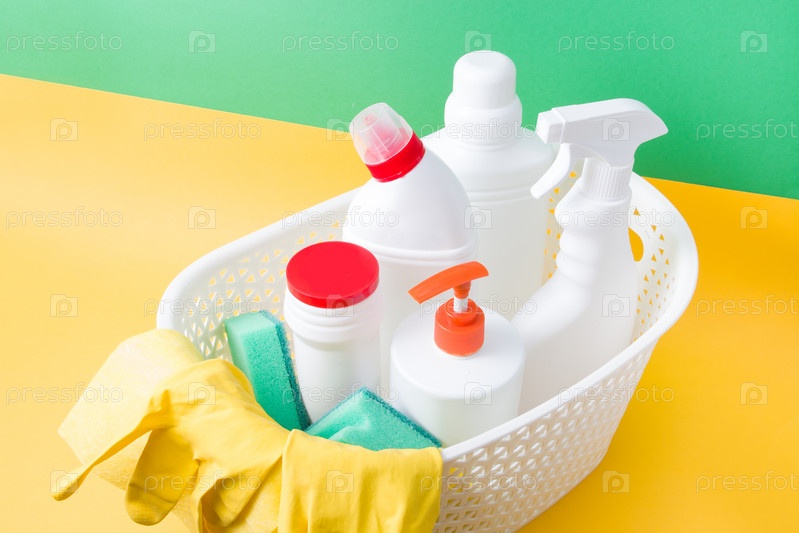 Зеленые губки для мытья, желтые резиновые перчатки, желтая тряпка для уборки и различные белые пластиковые бутылки с моющими средствами для дома в корзине на желто-зеленом фоне