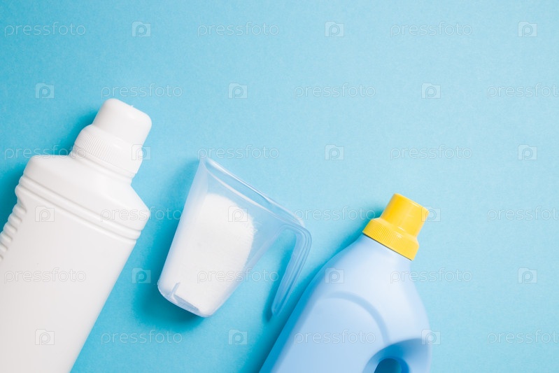 Синяя пластиковая бутылка с гелем для стирки детской одежды, мерный стакан со стиральным порошком и белая бутылка с отбеливателем на голубом фоне, пространство для копирования, вид сверху
