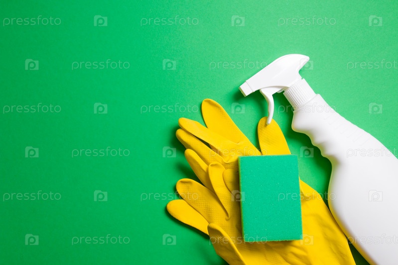 Зеленые губки для чистки, желтые резиновые перчатки и белая пластиковая бутылка с распылителем для моющего средства на зеленом фоне копией пространства вид сверху
