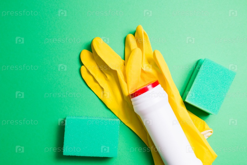 Зеленые губки для чистки, желтые резиновые перчатки и белая пластиковая бутылка для стирального порошка на зеленом фоне копией пространства вид сверху