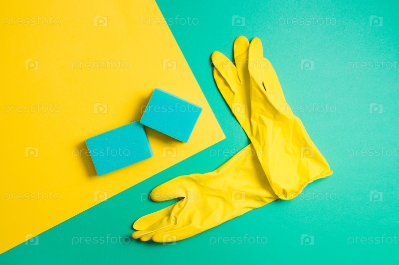 Желтые резиновые перчатки и губки для мытья посуды на зеленом и желтом фоне опийных сидений вид сверху концепция мытья посуды