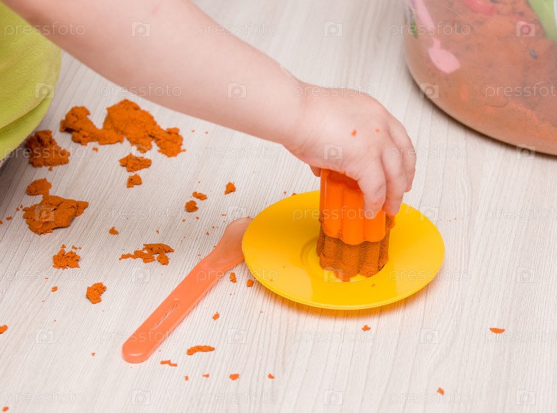 Маленькая детская рука делает кекс с оранжевым песком на бежевом столе, желтую пластиковую игрушечную тарелку, играет с песком дома