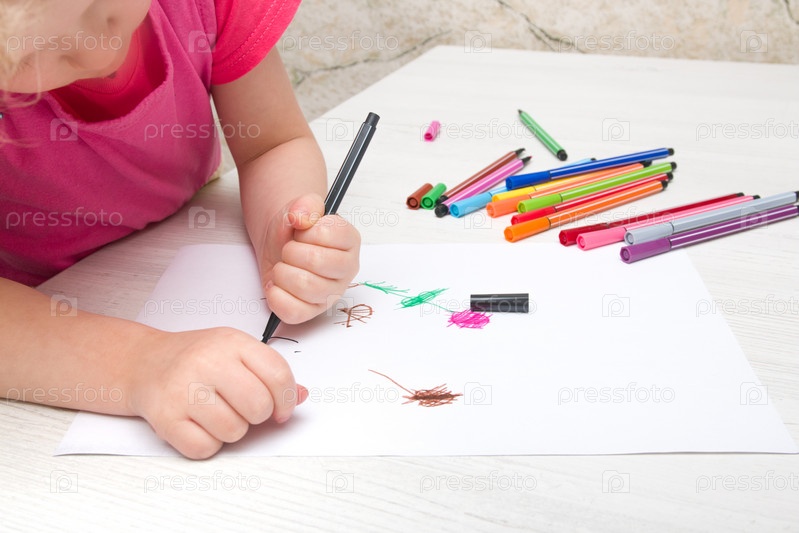 Маленькая девочка рисует цветы на бумаге фломастером копирует место за столом, развитие детей