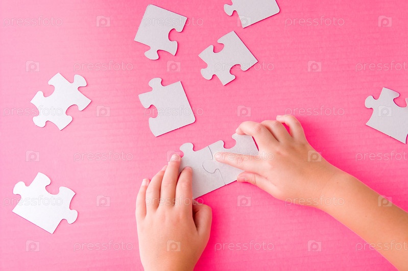Детские руки складывают бумажный белый пазл на розовом фоне развитие мелкой моторики рук