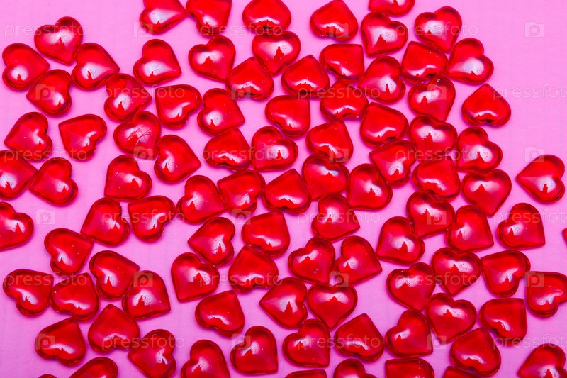 Много маленьких красных стеклянных сердечек на розовом фоне место копировать вид сверху концепция дня святого валентина поздравительная открытка и фон для праздника