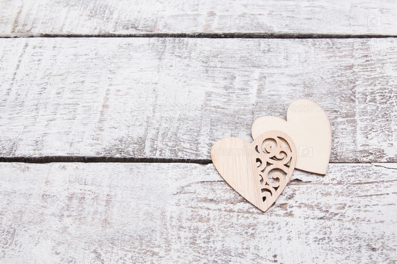 Деревянные сердца на серых досках, пространство для копирования, состаренные деревянные доски, окрашенные в белый цвет, текстура дерева, натуральный материал, концепция любви в День святого Валентина, лазерная резка сердечных узоров