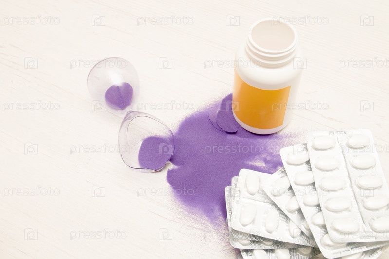 Разбитые песочные часы и лекарство на светлом фоне