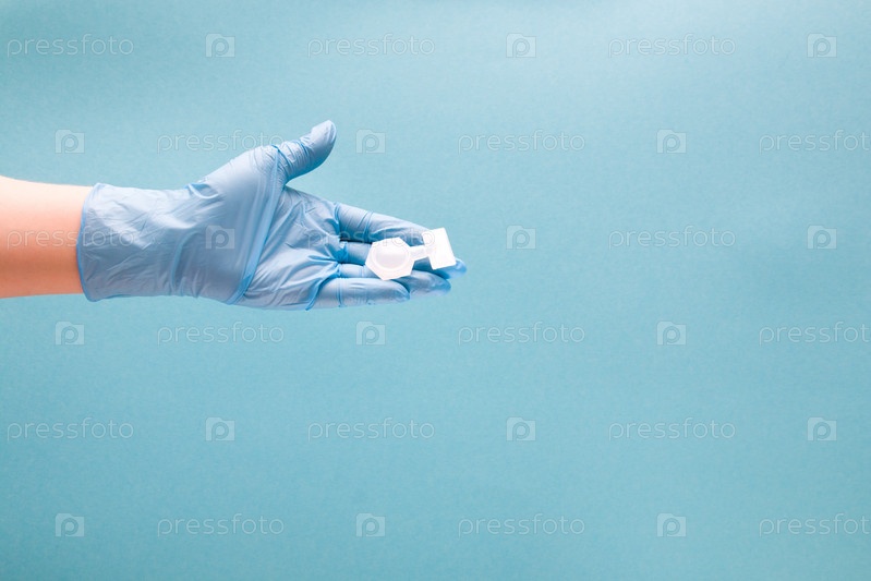 Женская рука в синей одноразовой медицинской перчатке держит контейнер с лекарством для ингаляций на ладони, пространство для копирования на синем фоне, лечение астмы и бронхоспазма, концепция пульмонолигии