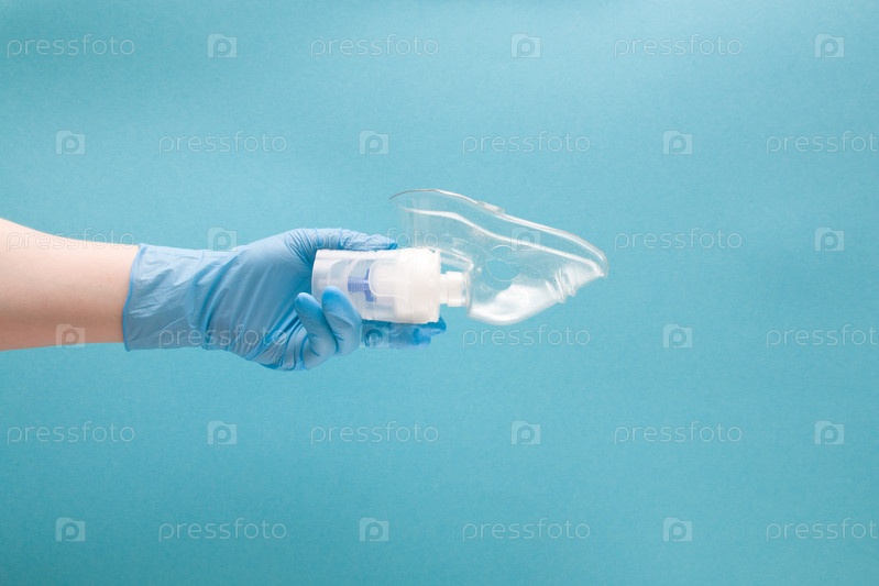 Женская рука в синей одноразовой медицинской перчатке держит резервуар для небулайзера с силиконовой маской, ингаляционное устройство, концепция пульмонологии, синий фон, пространство для копирования