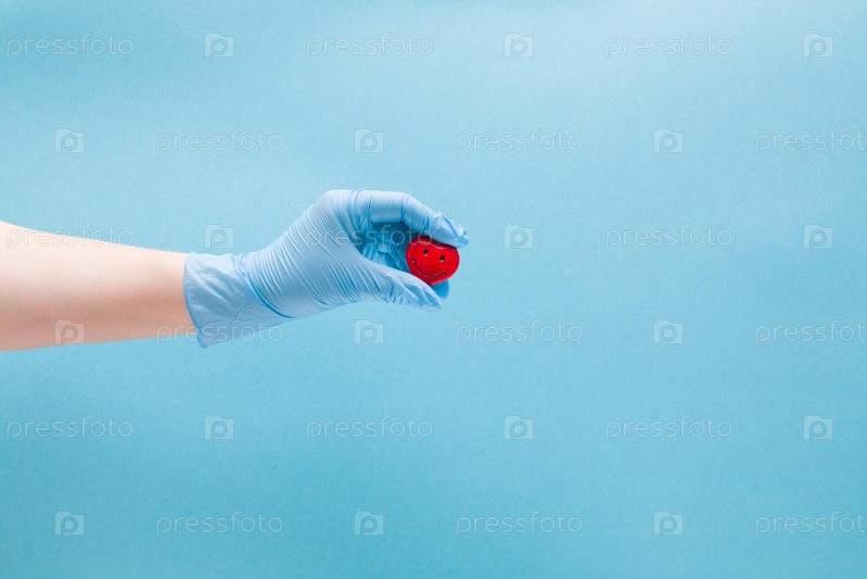 Женская рука в синей одноразовой медицинской перчатке держит маленькое красное сердце с улыбкой, улыбающееся сердце, концепция здравоохранения, синий фон, пространство для копирования, лечит вари-кардиолог
