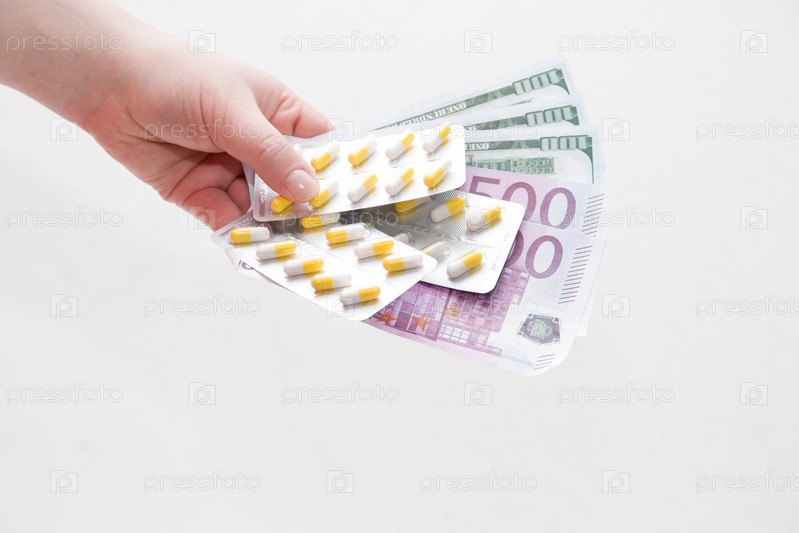 Женская рука держит упаковку желтых капсул, таблеток и долларовых банкнот евро и долларов, белый фон