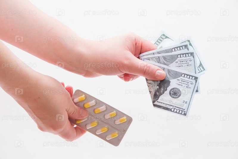 Женские руки держат пачку желтых и белых таблеток, капсул, лекарств и денежных купюр на белом фоне