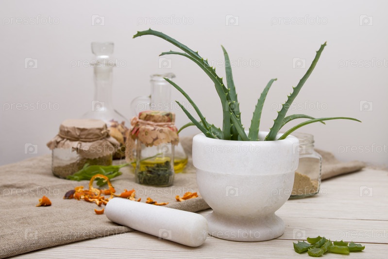 Белая каменная чашка с листьями алоэ, натуральная медицина, натуральные ингредиенты и лекарства для профилактики и лечения сезонных простуд, травяные чаи, стеклянные банки и графины, светлый фон, пространство для копирования, горячие продажи