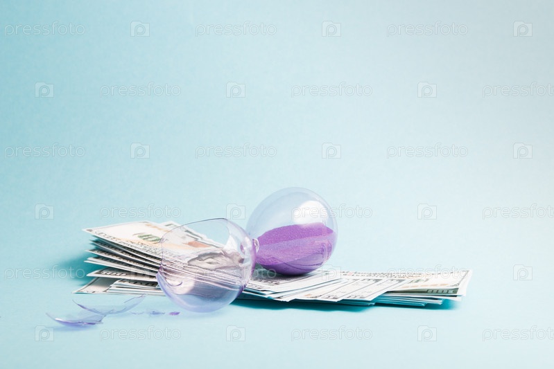 Разбитые песочные часы с фиолетовым песком и долларовыми банкнотами