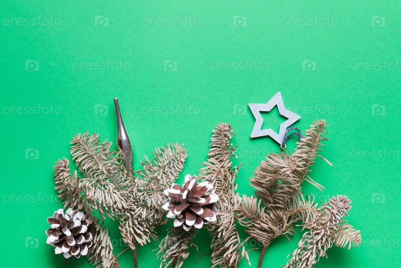 Ветки декоративной ели, украшенные сосновыми шишками и елочными игрушками, пространство для копирования на зеленом фоне