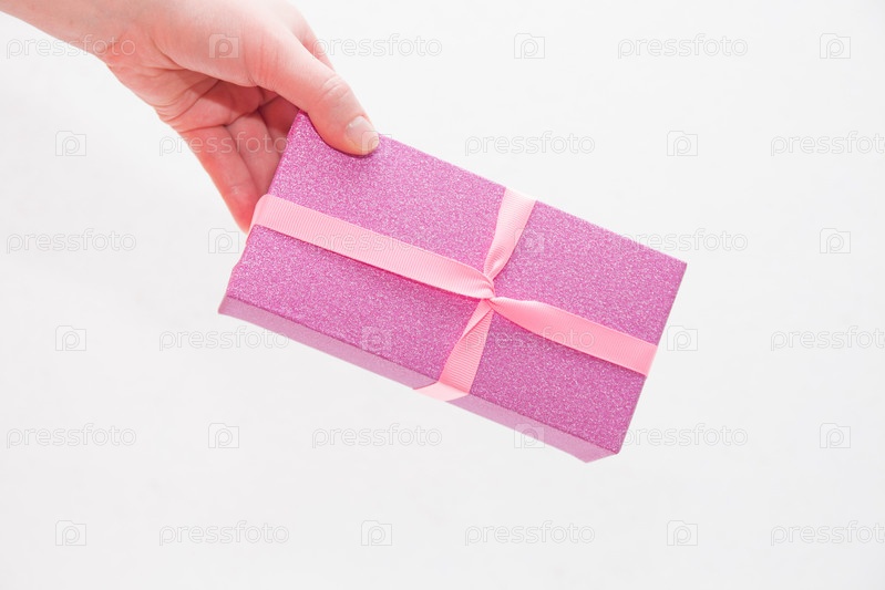 Розовая блестящая подарочная коробка на светло-белом фоне с розовым бантом в горошек, вид сверху