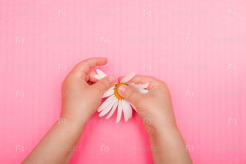 Детская рука отрывает лепестки от цветка ромашки белый розовый фон вид сверху копией пространства