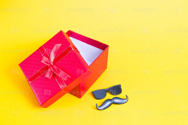 Красная открытая коробка с красным бантом из ленты и миниатюрными пластиковыми черными усами и очками на желтом фоне, пространство для копирования, концепция дня отца