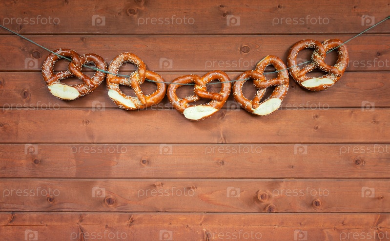 Свежеиспеченные крендельки висят на бельевой веревке у деревянной доски. Фон для Октоберфеста