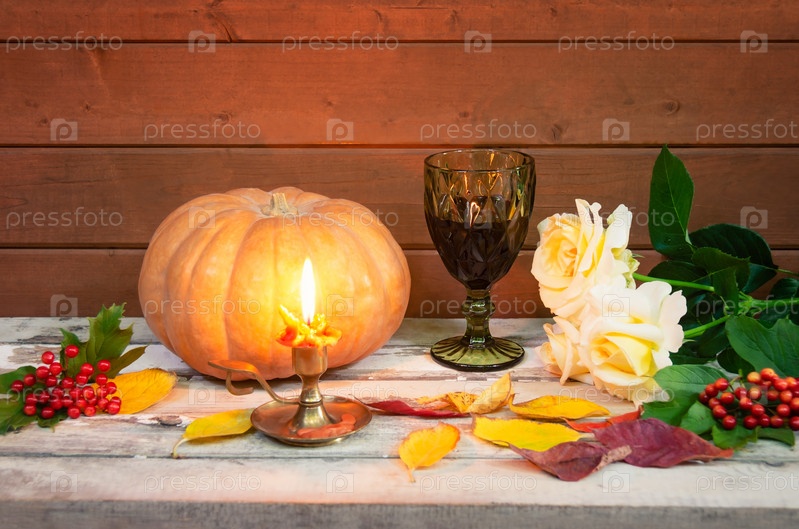 Бокал красного вина, горящая свеча, белые розы, тыква, осенние листья и ягоды калины. Выборочный фокус