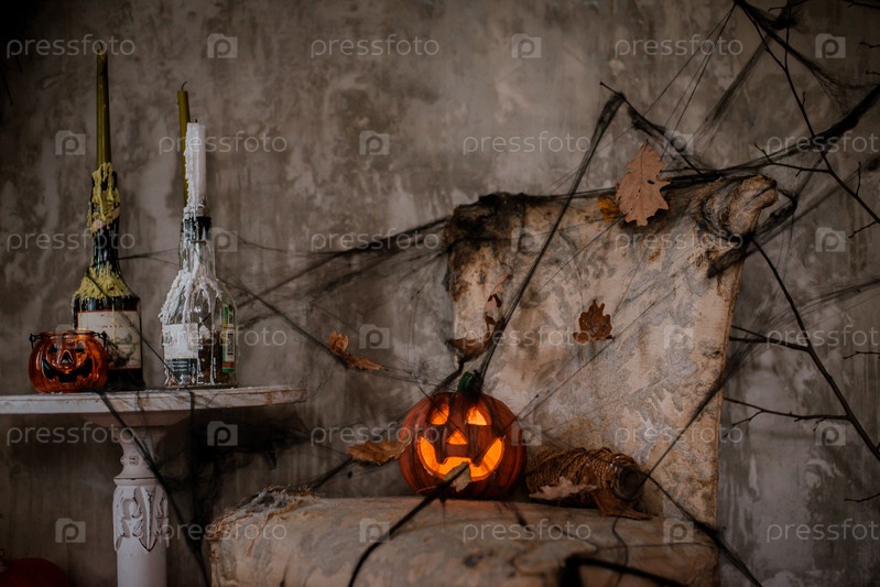 Фон украшений для празднования Хэллоуина. Страшная композиция с тыквой Джека и горящими свечами, паутиной и ведьминой метлой на бетонной стене