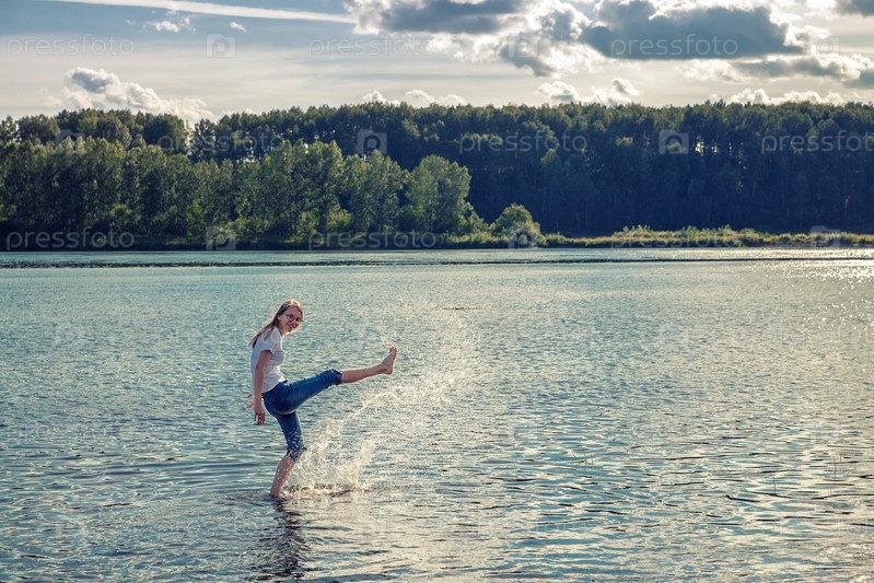 Девочка подросток с длинными волосами в синих джинсах гуляет на берегу реки