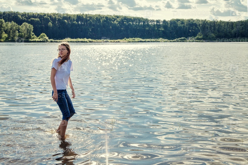 Девочка подросток с длинными волосами в джинсах на берегу реки