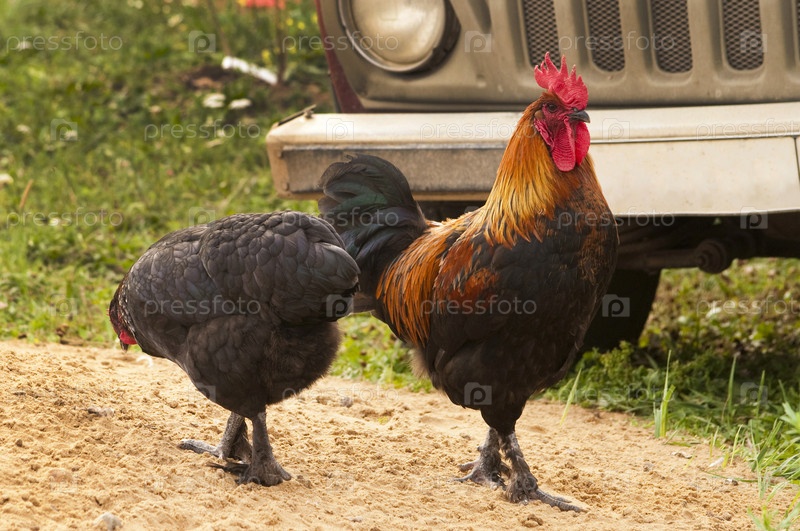 Петух и курица гуляют во дворе на фоне автомобиля