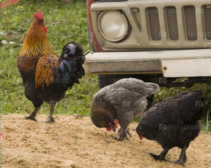 Петух и курица гуляют во дворе на фоне автомобиля