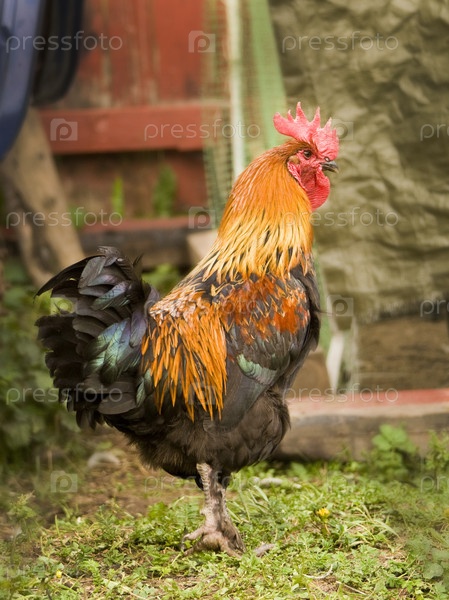 Фотография красочного петуха, прогуливающегося по двору.Очень яркое красивое оперение