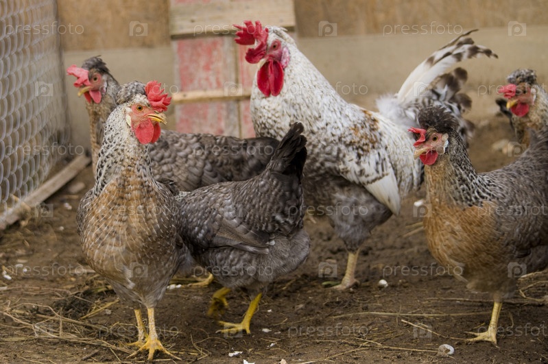 Фотография петуха и кур породы Легбар кремовый, прогуливающегося по птичьему двору