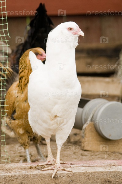 Белая курица породы амераукана прогуливается по птичьему двору. Серьезно смотрит на зрителя