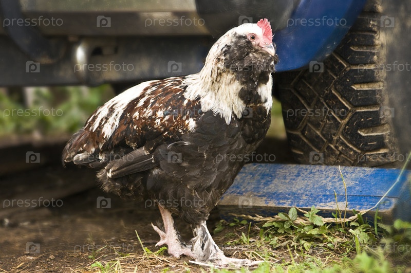 Фотография курицы породы Фавероль, прогуливающейся по птичьему двору на фоне колес автомобиля