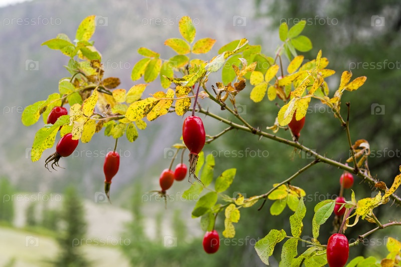 Спелые плоды дикого шиповника. Август. Горный Алтай