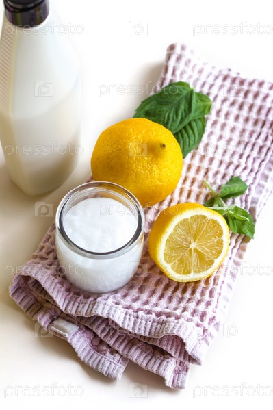 Приготовление кондиционера для волос из лимона и мяты. Натюрморт на полотенце с емкостью для косметики