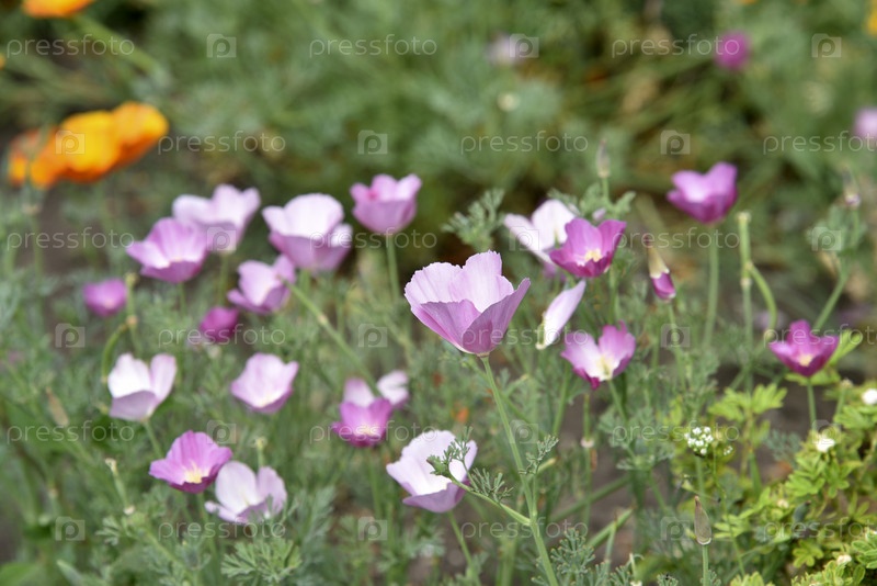 Светло-розовые нежные цветы ашкольца на клумбе в летнем саду. цветки Escholtia Papaveraceae крупным планом