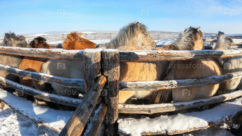 Лошади стоят в открытом загоне зимой, Колыма, Якутия, Россия