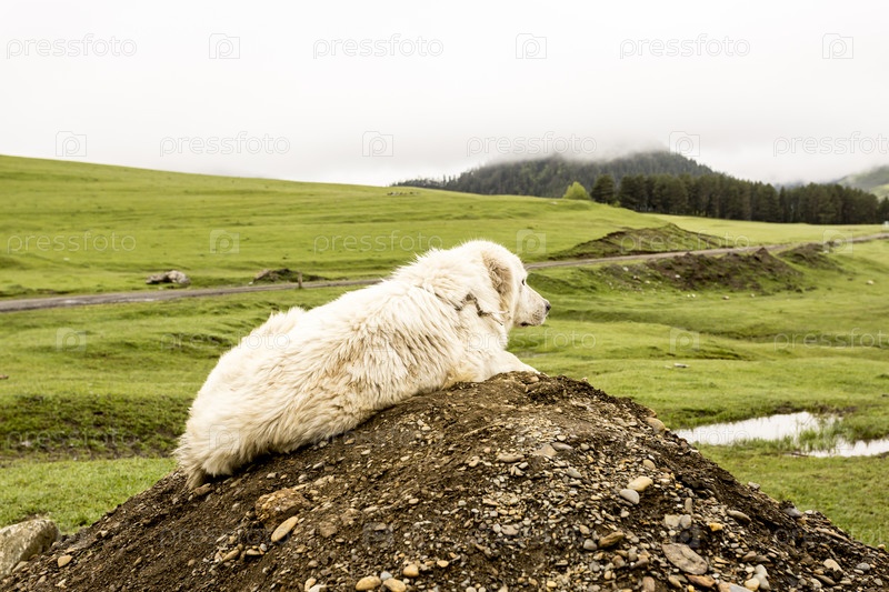 Белая грустная одинокая собака ищет своего хозяина на проселочной дороге. Грузия, Тушети