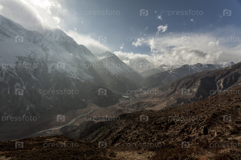 Туманные горы. Утро в Гималаях. Долина реки Марсьянгди, Непал, заповедник Аннапурна