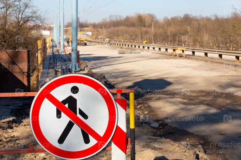 Барьер, перегораживающий тротуар, и знак с изображением перечеркнутого мужчины, запрещающий проход пешеходов