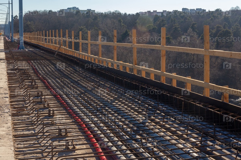 Восстановление городского моста. Проложены новые арматурные обвязки, а также кабели и другие коммуникации, защищенные пластиковыми кожухами. Участок подготовлен к бетонированию