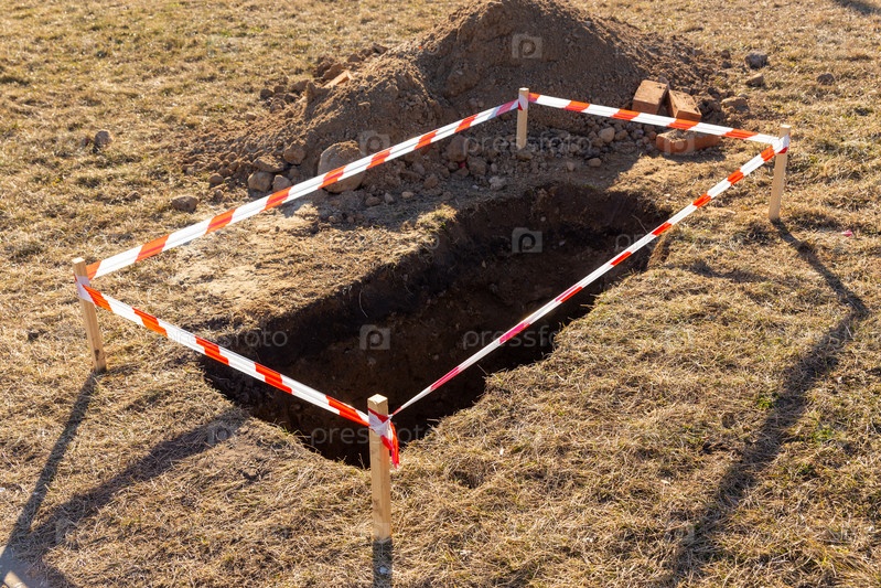 Археологические раскопки посреди поля. Небольшое отверстие в земле огорожено красной и полосатой строительной лентой. Ров в земле. Строительные работы