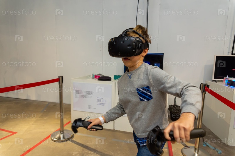 Восьмилетний мальчик носит виртуальную гарнитуру, держит в руках контроллеры и наслаждается новым опытом в видеоиграх