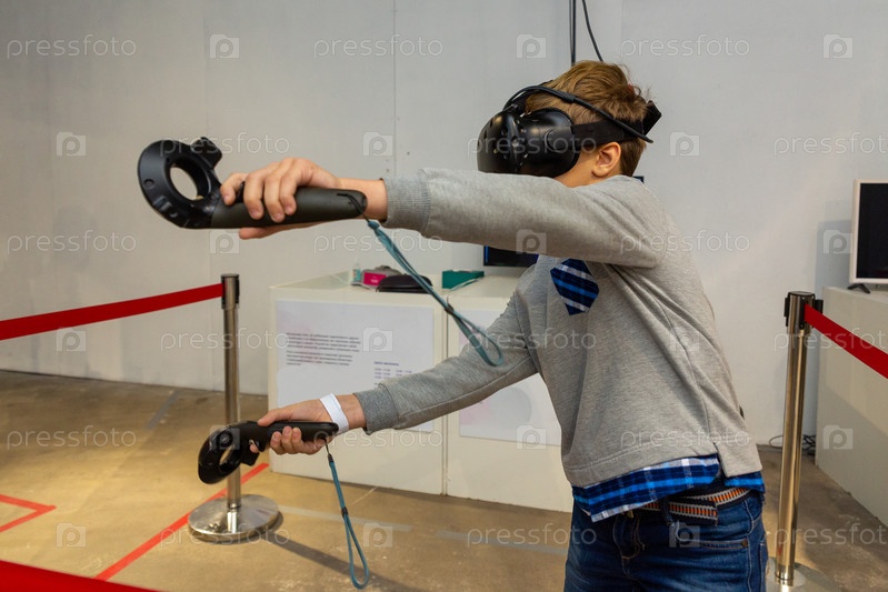 Восьмилетний мальчик носит виртуальную гарнитуру, держит в руках контроллеры и наслаждается новым опытом в видеоиграх